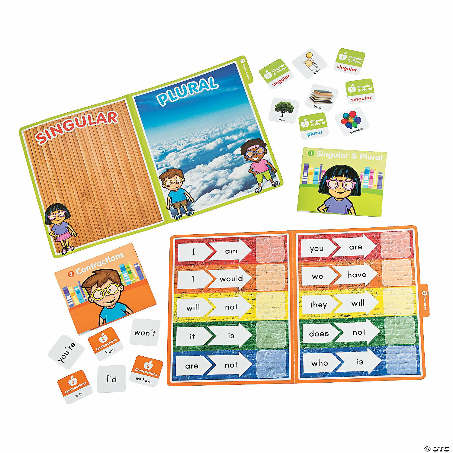 These self-correcting educational games are must-have classroom supplies for teaching language arts. Practice singular/plural, contractions, past/present/future, their/theyβre/there, to/two/too and verbs/adjectives/adverbs with these file folder games. Reinforces students’ understanding of these important grammar concepts. 6 games per box. Grades 1-3. Cardstock. Sturdy storage box, 12″ x 9 3/4″ x 1 1/2″. Β© OTC