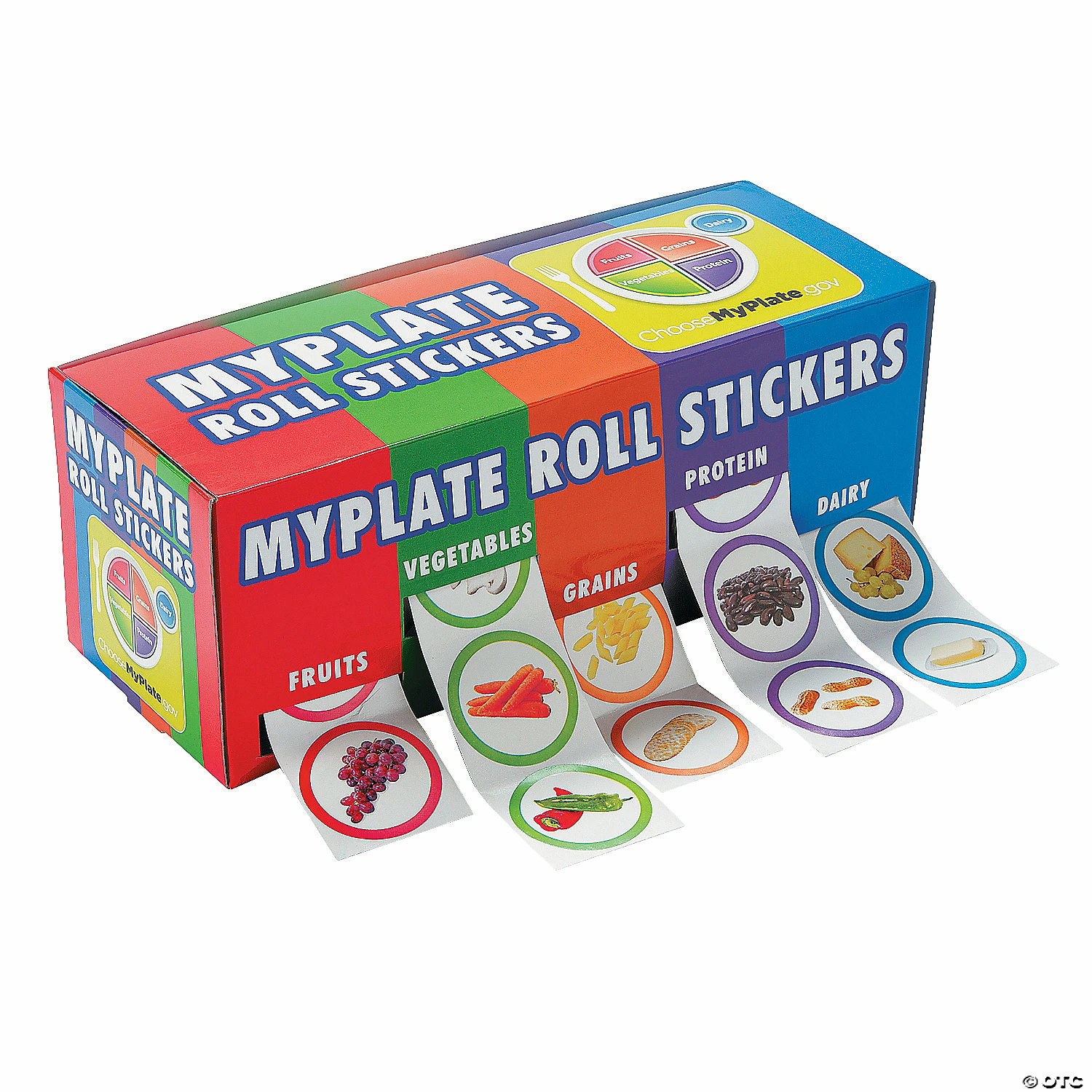 These stickers make great classroom supplies. Make learning all about balanced nutrition fun with stickers from various food groups. An easy-to-use dispensing box keeps rolls organized. Colored sticker borders match food groups in MyPlate standards. 9″ x 31/2″ x 3″ cardboard box with 5 rolls of 1 1/2″ diam. stickers. Includes 100 stickers per roll. Β© OTC