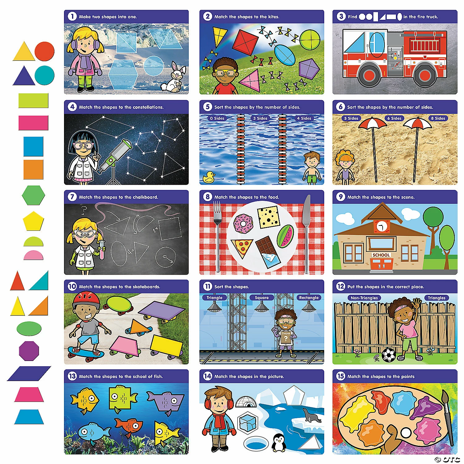 Add this Math tool to your classroom supplies. Place these mats on the magnetic Kidboard™ (item number 13762259), sold separately, to explore essential shape and spatial concepts. Includes fifteen laminated paper mats along with twenty-one shape magnets. Vinyl and paper. (36 pcs. per unit) Boards, 12 1/2″ x 8 1/2″; shapes, 1″ – 4 3/4″. © OTC