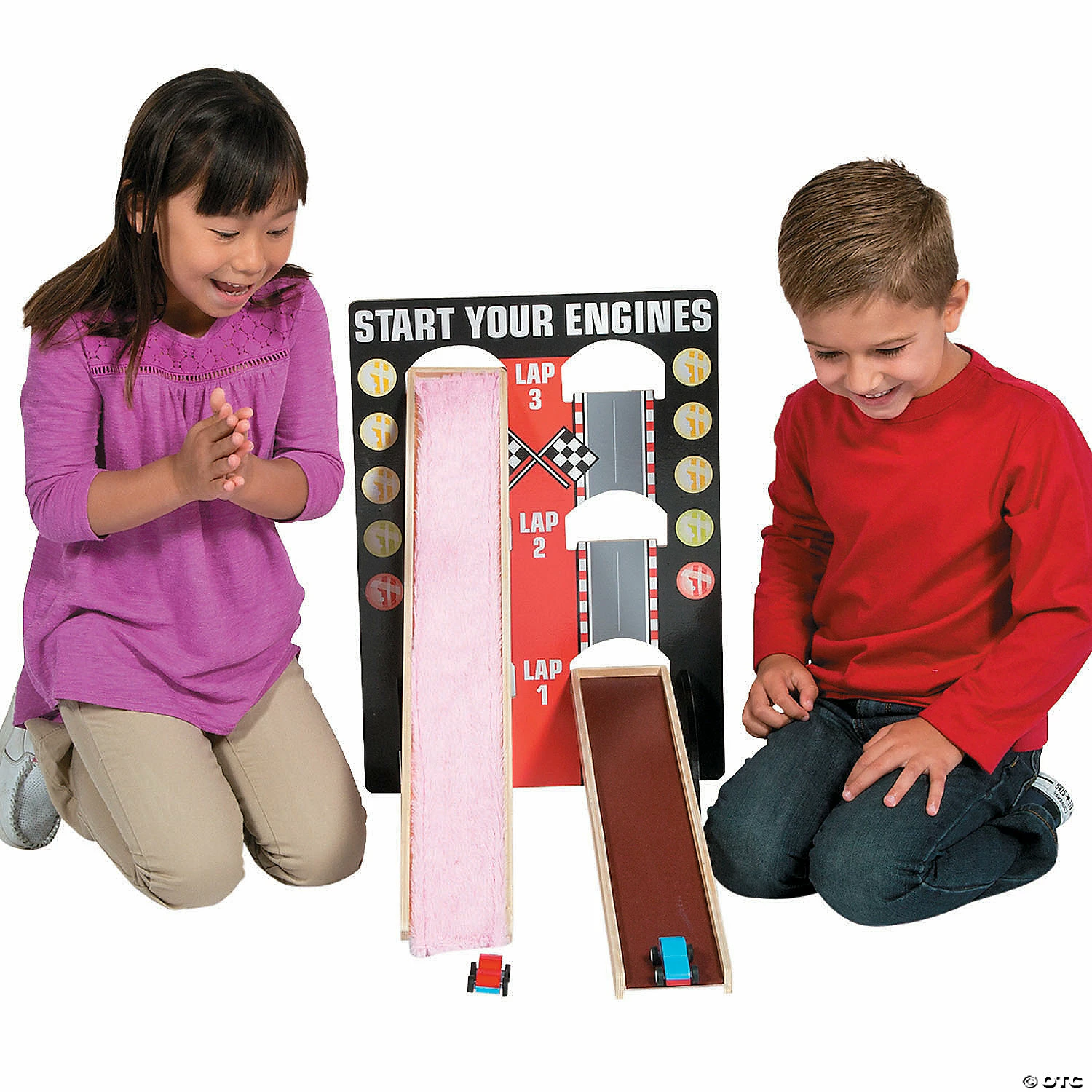 This fun STEM activity is a hands-on way for students to learn and understand the concepts of motion and friction. Featuring three different heights and various materials and fabrics, this activity is designed for students to test and observe how different materials and fabrics affect the speed of cars. Engineered for learning fun, this is a durable, interactive activity that is easy to incorporate into existing curriculum. Each strip has velcro that adheres directly onto the wooden ramp. Includes 8 strips of different materials and 6 plain strips for decorating with your own materials. Wood. (21 pcs. per unit) Board, 14 3/4″ x 20 1/4″; ramps, 3 3/4″ x 26″. ยฉย OTC