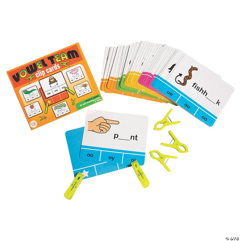 Working on vowel teams with your learners? Make it easier than ever for them to grasp the concept of two vowels working together to create a sound. Perfect for language arts curriculum and learning games, this activity has students pick a card, reference the image and then select the correct vowel team by placing a plastic clip on one of the three answer choices. Even better, each card is self-checking as it has a star on the back behind the correct answer, meaning this can be used for individual learning as well as small groups or partners. Includes 50 cards and 5 plastic clips. Cardstock. (55 pcs. per set) Cards, 5″ x 4″; sturdy storage box, 5 3/4″ x 4 3/4″ x 1 1/2″. Β© OTC